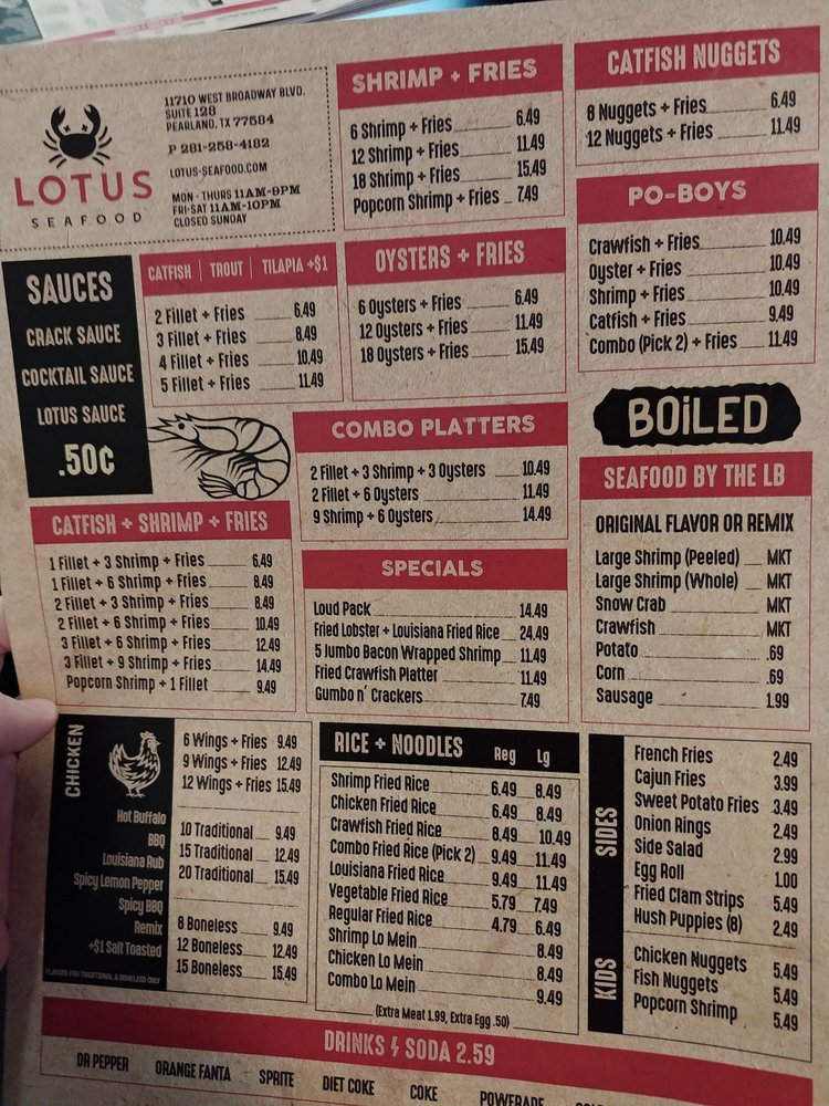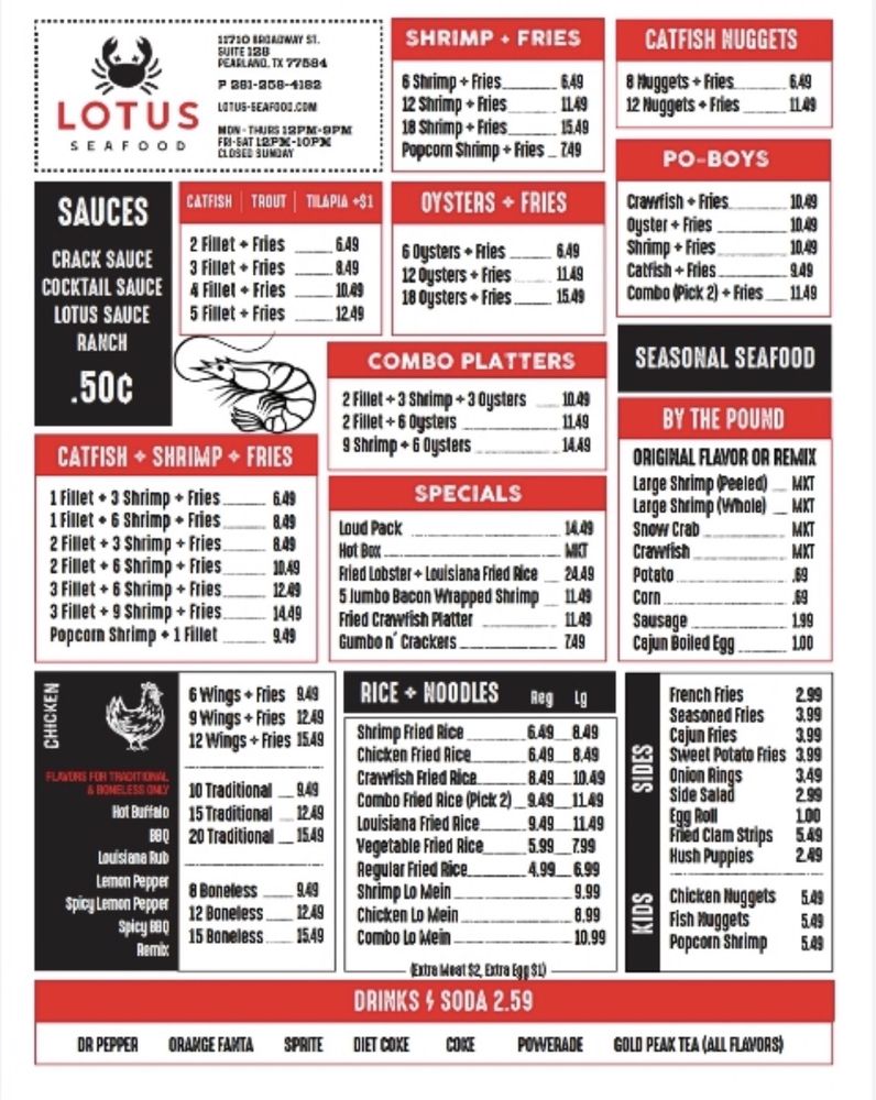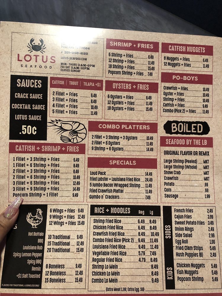 Introducing the menu at Lotus Seafood Pearland, located at 11710 Broadway St #128, Pearland, TX, is a seafood lover’s dream come true. This vibrant eatery serves up delightful options such as Fried Catfish, Trout, and Tilapia starting from just $7. Each dish is perfectly cooked, with a crispy exterior that complements the tender fish inside.